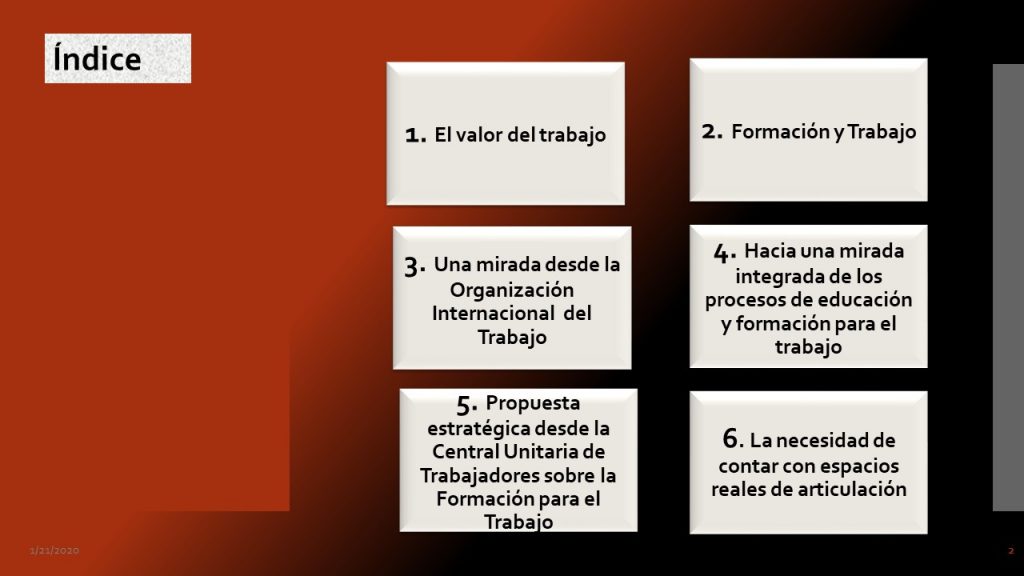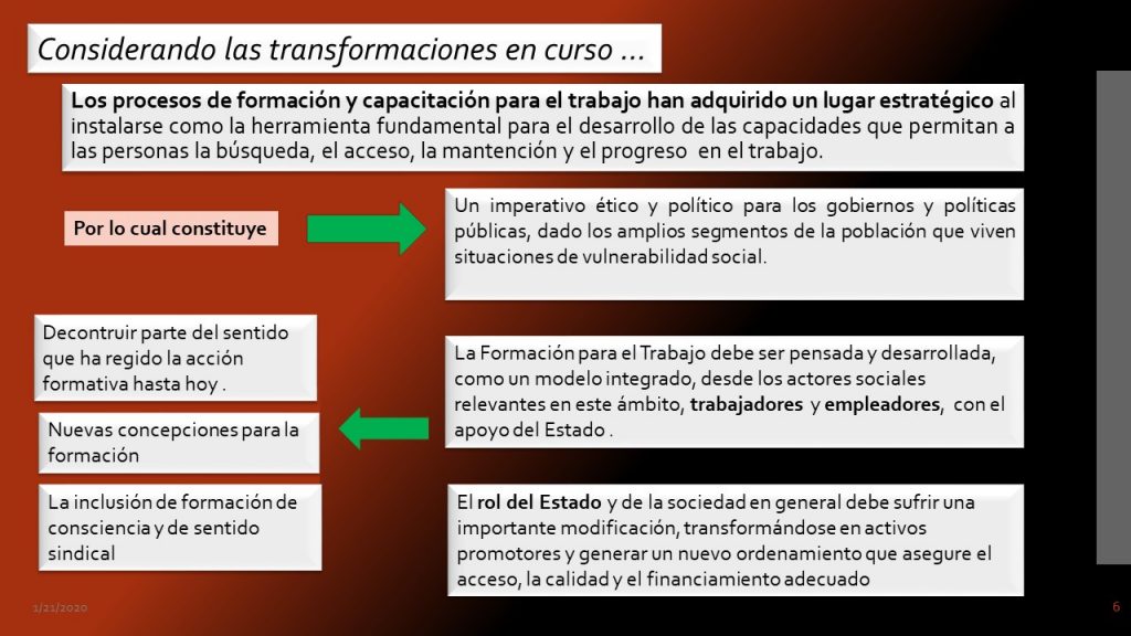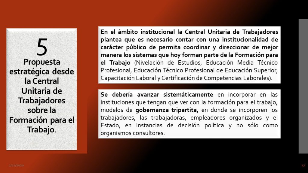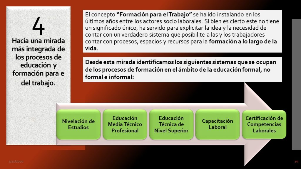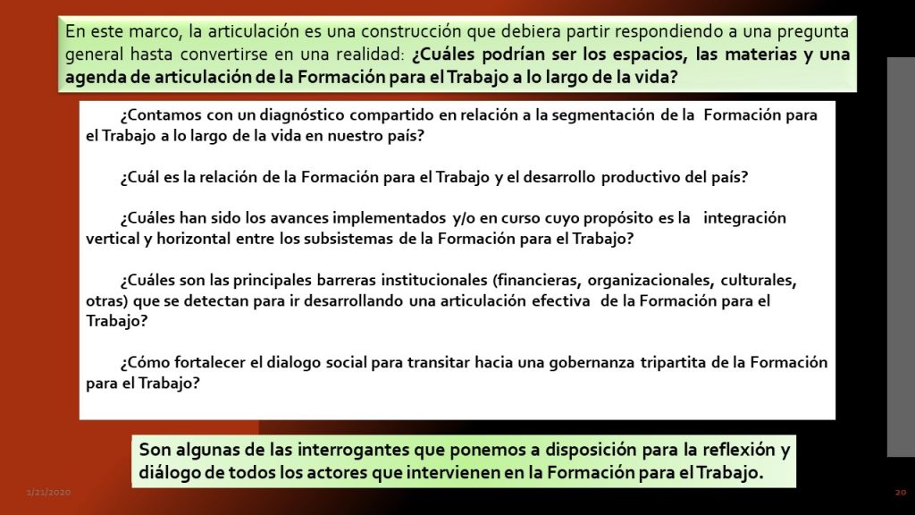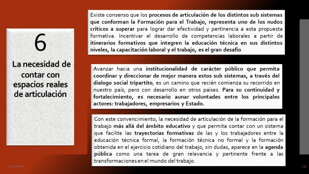 Un espacio para reflexionar, desde los actores claves, sobre la importancia de contar con un sistema único de formación para el trabajo o mejorar sustantivamente los mecanismos de coordinación y articulación de los sistemas existentes, y generar propuesta en este camino desde las diferente instituciones y actores involucrados.